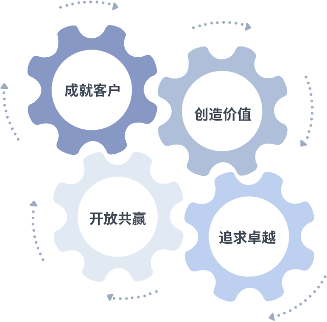 成就客户是一切决策的出发点,,创造价值是衡量所有工作的标准,,,追求卓越是我们做事做人的态度,,,,开放共赢是我们的格局也是最终的结果。。价值观的齿轮环环相扣,,推动着组织里的每个人不断向前。。。。