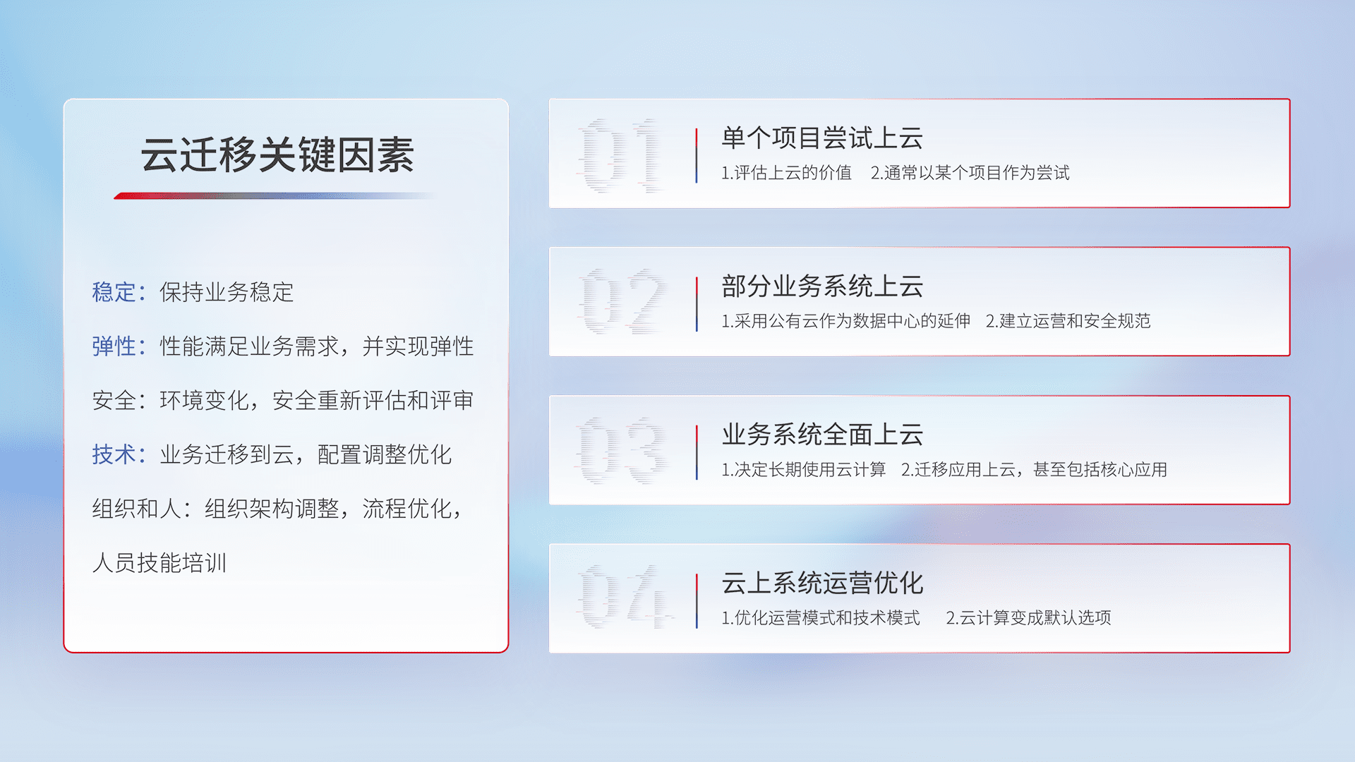 结合实际业务,,,,从规划设计、、云平台选型、、、云原生改造、、、、数据迁移、、集成交付,,迁移全过程为客户识别最佳上云路径,,,,做好风险识别管理,,设计网络架构、、、、身份权限、、、、安全审计合规、、、、操作审计、、、、日志审计、、、、监控告警策略、、、多站点容灾设计等,,,,对云上基础设施进行整体规划,,,提升IT治理水平,,,以满足弹性、、、高可用、、、、高性能的需求。。