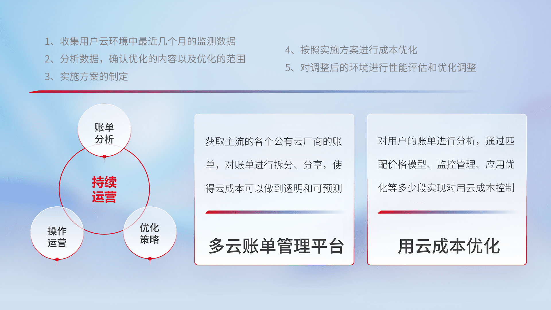 通过多云纳管,,,以统一的资源数据模型把客户的云资源进行抽象和封装,,,进而实现对多云资源的统一操作,,,保障云资源管理的可靠性、、、、稳定性与可用性。。。量身定制化运维内容,,配置、、、开发运维、、、补丁管理、、、备份、、、、监控、、认证和访问管理、、、审计和日常巡检等,,,保障在用云过程中的可靠度,,稳定度以及高可用率。。